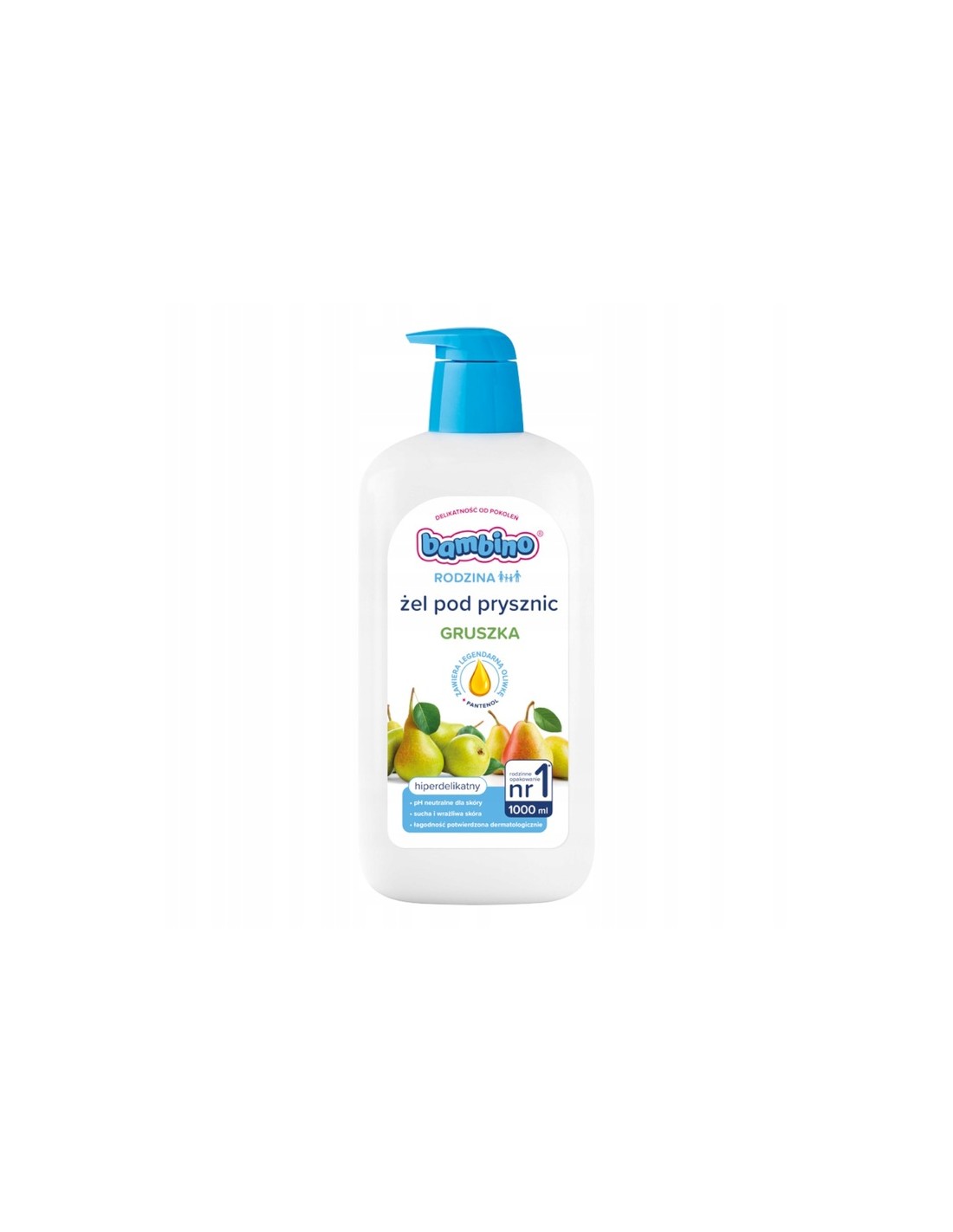 BAMBINO RODZINA Żel pod prysznic Płyn do kąpieli dla dzieci i dorosłych o zapachu gruszki, 1 lŁagodny żel pod prysznic i do kąpieli o owocowym zapachu gruszki do codziennego stosowania. Zawiera legendarną oliwkę i pantenol. Zapewnia uczucie nawilżenia skóry i przywraca jej komfort. Delikatna, lekka formuła, opracowana dla całej rodziny, skutecznie oczyszcza skórę i pozostawia uczucie świeżości oraz przyjemny zapach. Zawiera naturalny olejek i pantenol. Przeznaczony dla dorosłych oraz dzieci od 3. roku życia. 92% składników jest pochodzenia naturalnego. Formuła nie zawiera mikroplastiku.To produkt w 100% wegański – nie zawiera składników pochodzenia zwierzęcego.