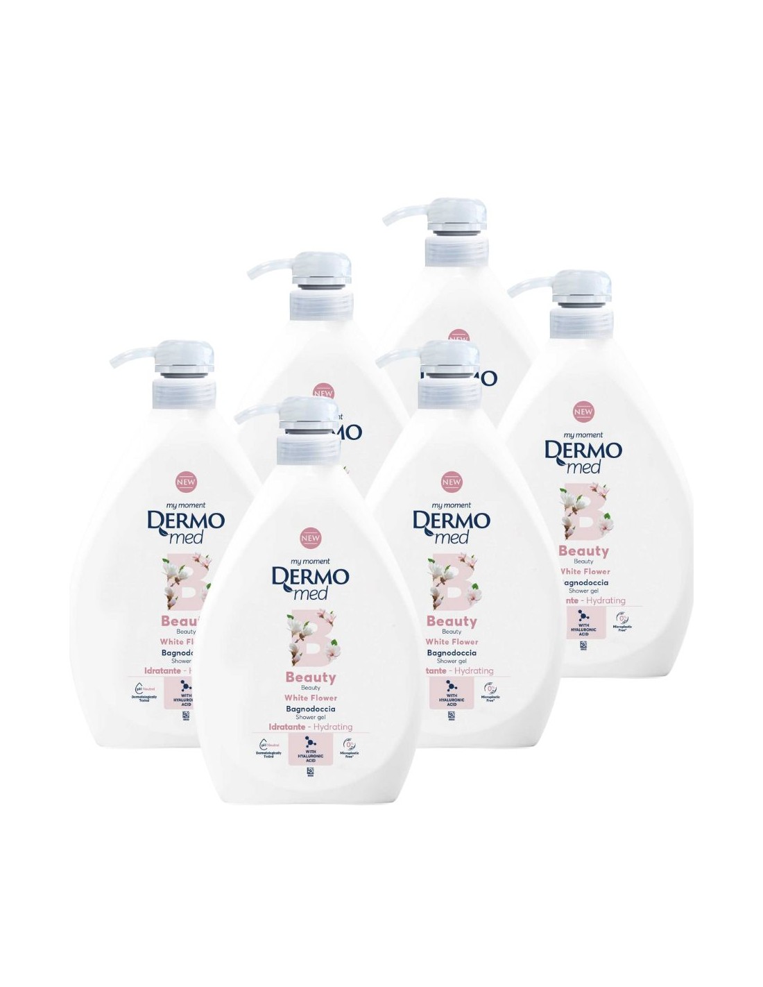 Żel pod prysznic DERMOMED BIAŁE KWIATY, z pompką, 6 x 1000 ml Jedwabiście kremowy, pachnący delikatnymi, białymi kwiatami żel pod prysznic DERMOMED delikatnie myje, pielęgnuje i chroni nawet najdelikatniejszą skórę, czyniąc ją pachnącą, miękką i jedwabistą.Włoski żel pod prysznic DERMOMED swoim kwiatowym aromatem zapewnia przyjemne uczucie odświeżenia i wyjątkowej pielęgnacji.Kosmetyk posiada neutralne, nie zawiera mikroplastików. Testowany dermatologicznie.Formuła żelu DERMOMED zawiera kwas hialuronowy o właściwościach zmiękczających i nawilżających skórę: