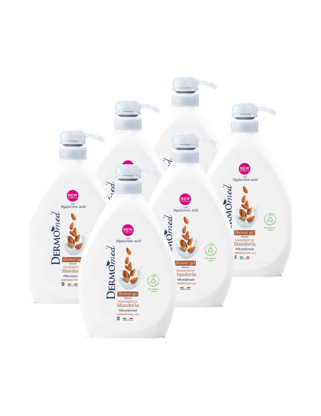 Żel pod prysznic DERMOMED MIGDAŁ, z pompką, 6 x 1000 ml Kremowy, delikatny żel pod prysznic DERMOMED o subtelnym zapachu przyjemnie otula i znacząco wpływa na poprawę nastroju i samopoczucia.Ten relaksujący, wyprodukowany we Włoszech żel pod prysznic nie tylko delikatnie myje i chroni skórę, ale też pielęgnuje, czyniąc ją jedwabiście gładką i aksamitną, a dodatkowo jego aromatyczny zapach przyjemnie relaksuje.Kosmetyk posiada pH 5,5, nie zawiera mikroplastików. Testowany dermatologicznie.Formuła żelu DERMOMED zawiera kwas hialuronowy i glicerynę o właściwościach zmiękczających skórę, nawilżających i regenerujących: